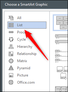 出现“选择SmartArt图形”窗口。在左侧窗格中,选择一个选项,该选项提供一种SmartArt图形,您可以在其中键入文本。在此示例中,我们将使用“列表”。