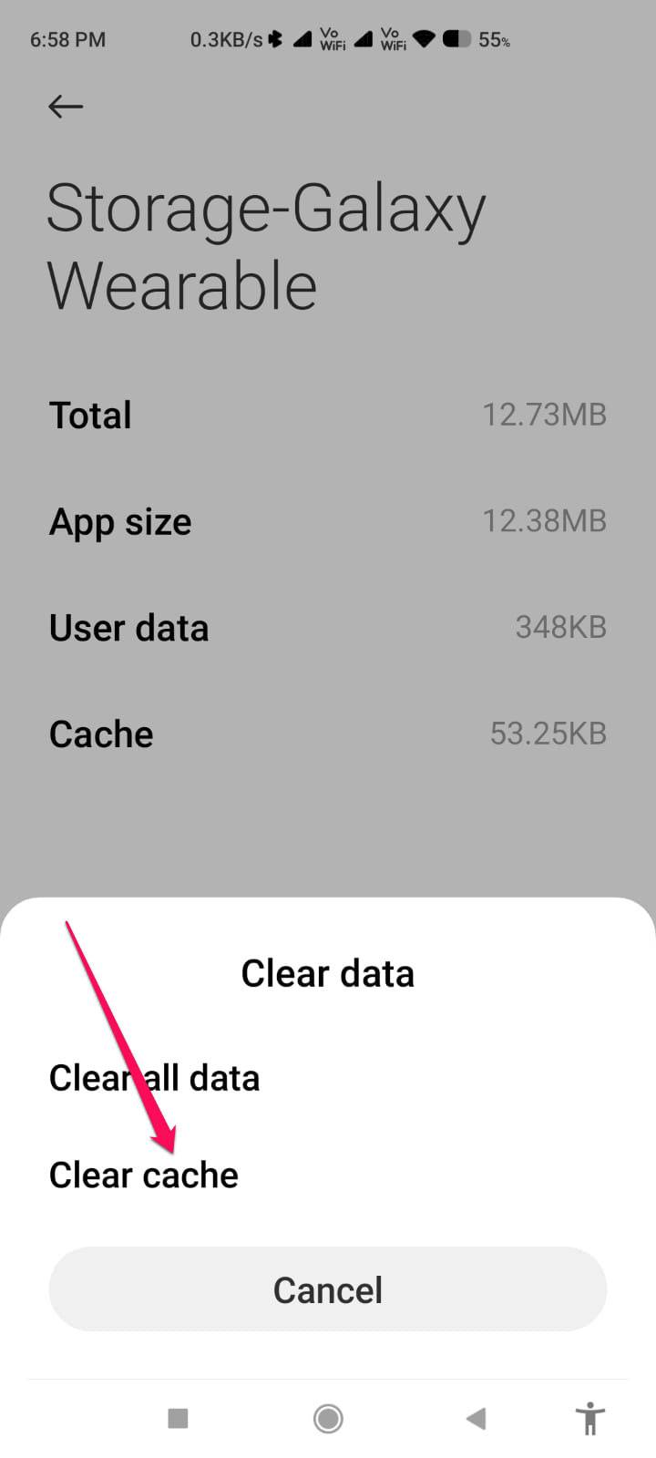 如果您的 Galaxy 可穿戴设备未连接到手机,请尝试清除 Android 手机上的缓存。您需要转到 Settings > Apps > Galaxy Wearable app > Storage > Clear Data来执行此操作。点击 清除缓存 按钮并重新启动手机。