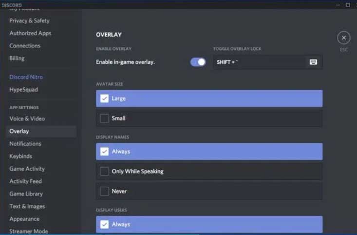 - 在 应用程序设置 菜单上,选择覆盖,然后访问 游戏内覆盖设置。