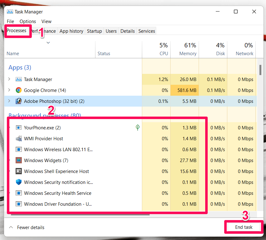 - 要单独关闭任务,请单击进程选项卡并选择应用程序。