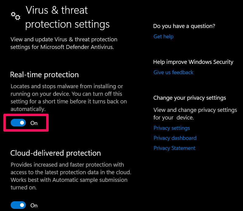 - 下一步是关闭实时保护。为此,请切换它旁边的按钮。