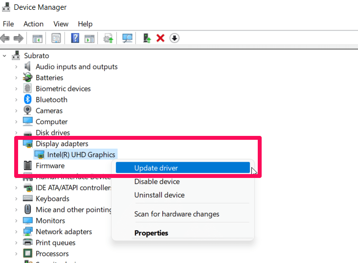 - 之后, 右键单击 专用显卡的名称以调出上下文菜单。