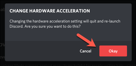更改设置以启用或禁用硬件加速将要求Discord客户端重新启动。在“更改硬件加速”弹出窗口中,单击“确定”以确认并重新启动客户端。