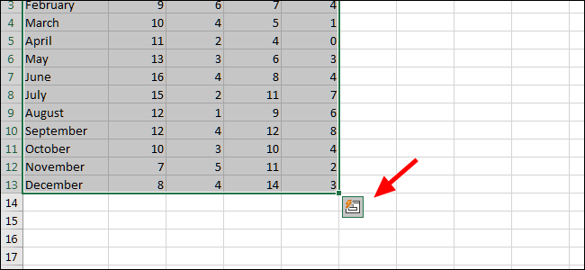 接下来,单击小的“快速分析”图标。您会在所选数据的右下方找到它。