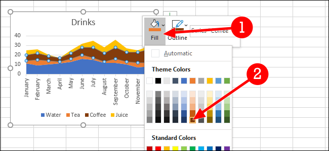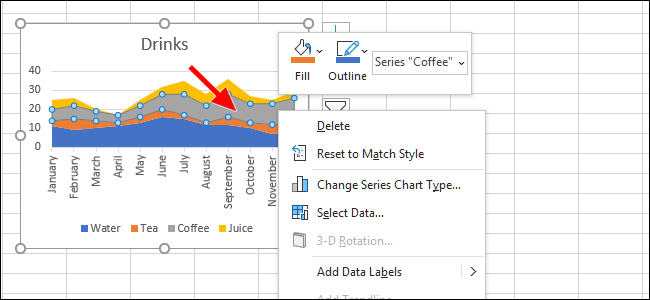 尽管我们的图表几乎是完美的,但让我们更改咖啡的颜色,使其与经常与之相关的颜色匹配:棕色。为此,我们将右键单击图表上该颜色区域内的任意位置以显示一些新选项。