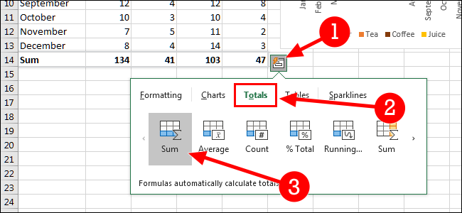 然后,单击“快速分析”按钮。这次,我们将选择“总计”选项卡,然后选择“总和”。