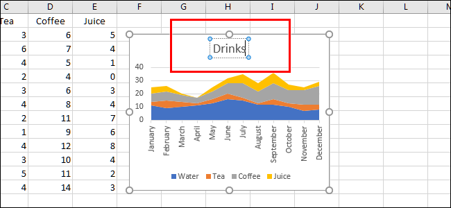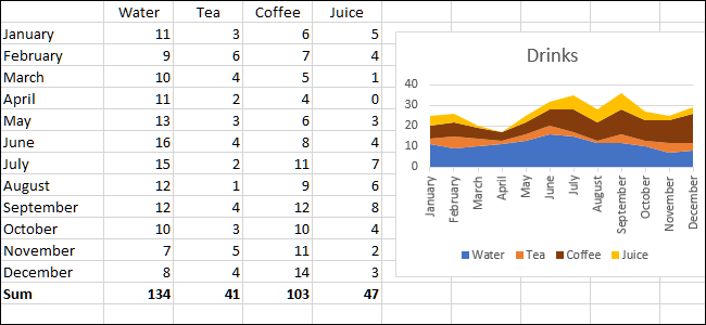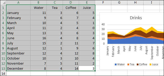 首先,我们将制作一个图表以便更好地了解我们的数据。在此示例中,这是在虚构餐厅购买的饮料类型的表。首先,我们将通过单击并拖动来选择要分组的单元格。