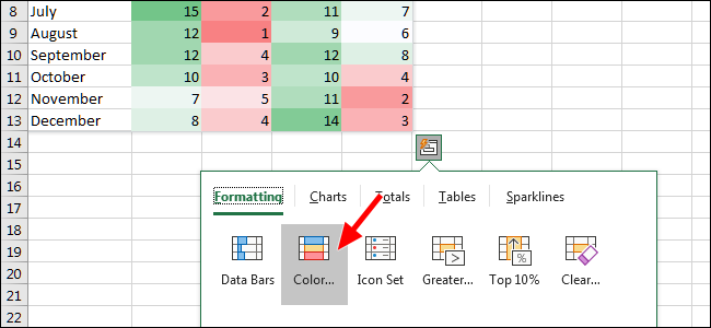 下一个可视化效果,即“色阶”,将根据每个单元格的值更改其颜色。当然,如果您希望使用其他颜色,也可以进行编辑。