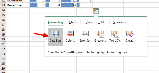 数据栏这个选项将每个单元格变成一个进度栏。我们表格中的最高值覆盖了单元格的宽度,每个附加条形都按比例缩放。