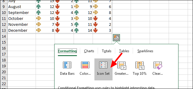 图标集选项在每个单元格旁边显示一个图标。这些也可以根据您的喜好进行定制。