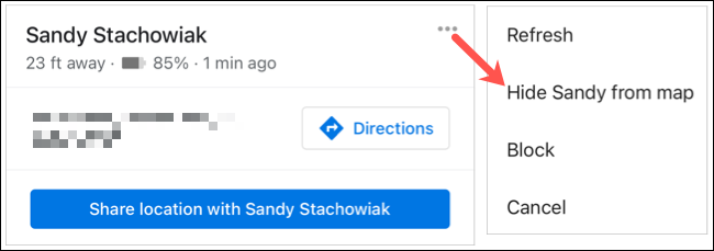 选择要隐藏的联系人,然后单击其姓名下方的“隐藏在地图上”。尽管它们仍会出现在您的位置共享列表中,但将从他们的地图视图中删除他们的照片或姓名首字母。