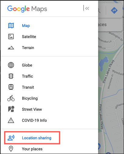 转到Google地图在线并登录。单击搜索框旁边左上角的三行菜单按钮,然后选择“位置共享”。