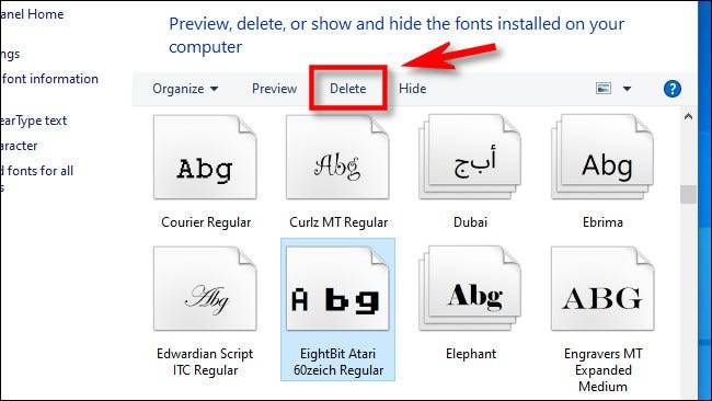 打开后,在文件夹中找到要删除的字体。选择您要删除的字体文件,然后单击工具栏中的“删除”按钮。(或者,您可以右键单击字体文件,然后从菜单中选择“删除”。)