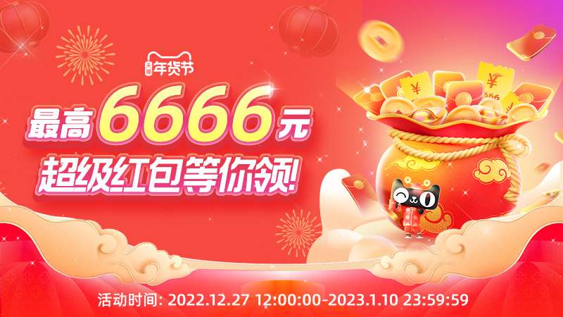 12月21日中午12点,年货节超级红包主会场取链。 12月27日中午12点,年货节超级红包首发!最高领6666元红包