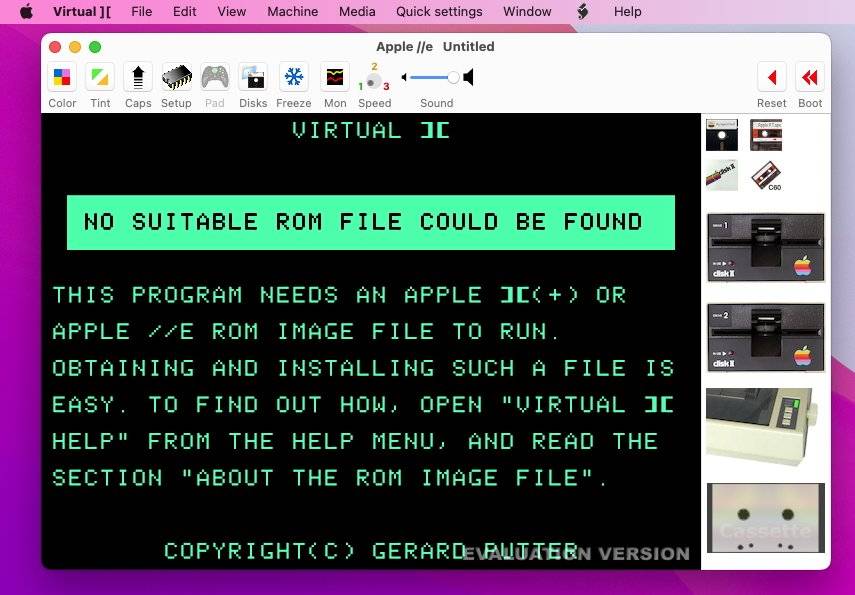 对于除在线模拟器之外的所有 Apple II 模拟器,您首先需要为每台特定机器准备一个 Apple II ROM文件。请注意,所有 Apple II ROM 代码仍受 Apple 版权保护,因此要合法使用 Apple II 模拟器应用程序,您必须首先实际拥有 Apple II ROM 芯片或包含 Apple II ROM 的 Apple II 计算机。