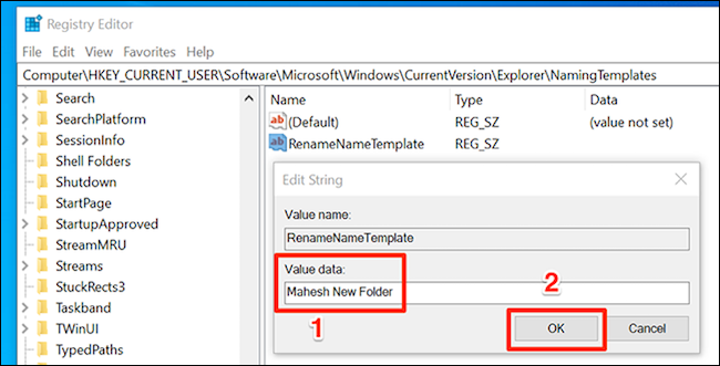 双击新创建的“ RenameNameTemplate”条目以将其打开。在屏幕上出现的“数值数据”框中,键入要用作所有新文件夹的默认名称的名称。例如,要将所有新文件夹默认命名为“我的新文件夹”,只需键入“我的新文件夹”。