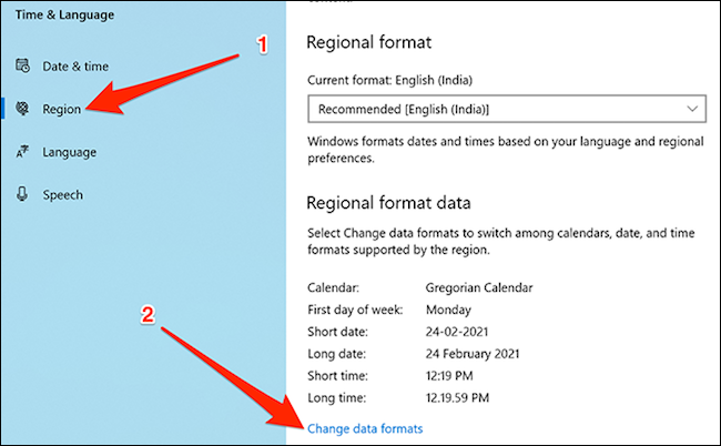 在左侧栏中选择“区域”,然后在右侧窗格中单击“更改数据格式”。