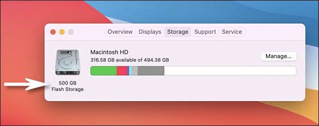 加载“存储”屏幕后,您会看到一个内部驱动器列表以及每个驱动器的容量。在我们的示例中,此MacBook Pro仅包含一个具有“ 500 GB闪存”的驱动器。