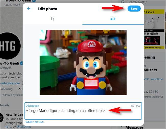 在出现的“描述”框中,输入您刚刚添加到推文中的图像的良好描述。良好的替代文字通常包含图像内容的简洁文字描述。之后,单击右上角的“保存”。