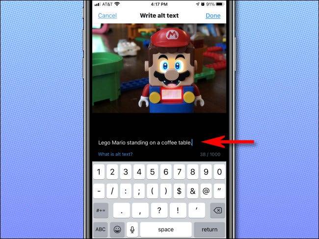 接下来,输入您要添加的描述。良好的替代文字说明描述了图像中的字面意思,因此可能看不到图像的人可以理解人们在说什么以及为什么要共享图像。准备好后,点击“完成”。