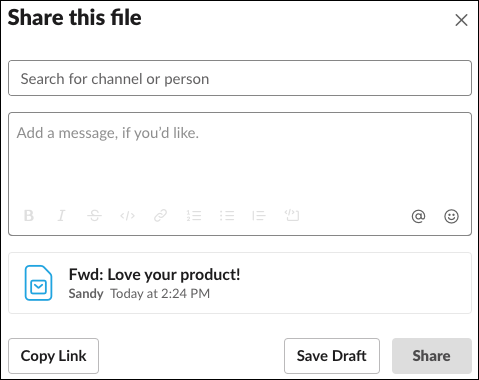 可能是客户对您公司产品的好评,或者是总部团队的项目清单。无论电子邮件包含什么内容,都可以与您的Slack工作区共享,甚至可以将其保留为私人引用。