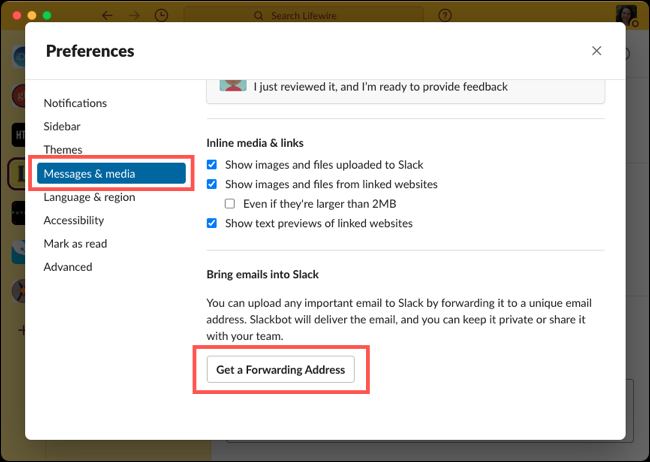 在菜单中,选择“消息和媒体”,然后滚动到那些设置的底部。您将看到一个名为“使电子邮件进入松弛状态”的小节,其中简要介绍了该功能。单击“获取转发电子邮件地址”。