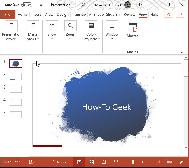 现在,您可以关闭VBA窗口。返回Microsoft PowerPoint,再次在“视图”选项卡中单击“宏”。
