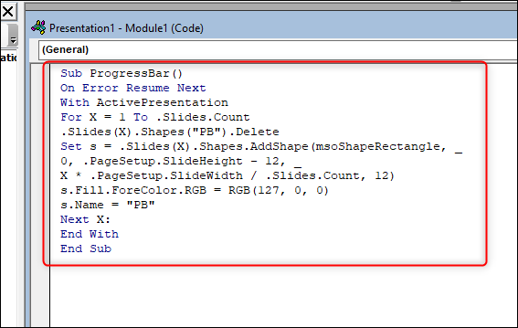 为了使所有内容保持一致并避免您头疼,可以 使用宏创建进度条。使用此宏,进度条将根据演示文稿中的幻灯片数量自动进行自我调整。