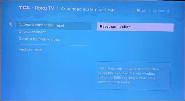 选择“重置连接”选项,然后按遥控器上的“确定”按钮。您的Roku将重新启动,并需要一些时间来忘记其Wi-Fi网络详细信息。