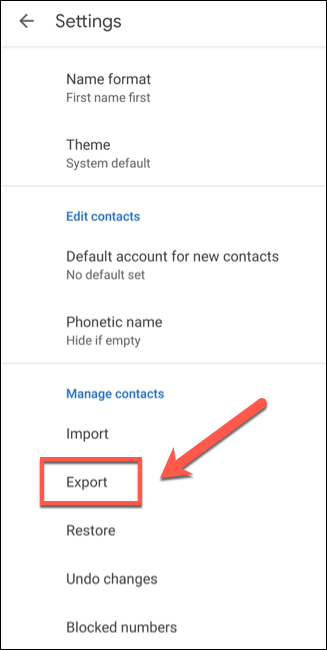 在“设置”菜单中,点击底部“管理联系人”类别下列出的“导出”选项。