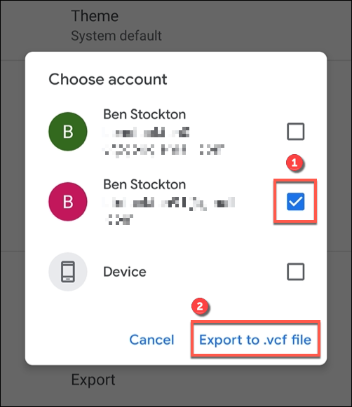 如果您在设备上登录了多个Google帐户,请点击您要导出的帐户旁边的复选框。准备就绪后,选择“导出到.VCF文件”选项。
