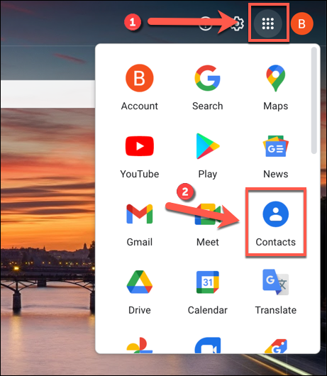 为此,请打开Gmail网站,然后点击右上角的应用程序菜单图标(由多个点组成)。从下拉菜单中,选择“联系人”选项。