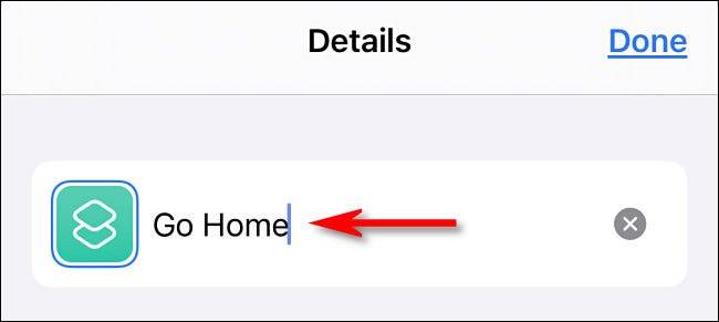 当您看到“新建快捷方式”页面时,点击名称旁边的省略号按钮(三个点)。在弹出的屏幕上,将快捷方式名称设置为所需的名称。对于我们的示例,我们使用了“回家”。设置名称后,点击“完成”。