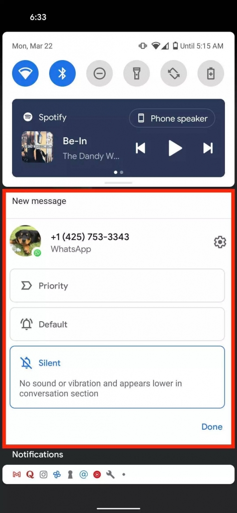 Android 11具有“促进”的对话。现在,来自短信和其他聊天应用程序的所有对话都显示在其自己的部分中,与其他通知分开。此外,您可以控制这些对话的优先级-您可以允许它们正常显示,将某些对话设置为始终显示在列表的顶部,或者使它们“无声”,从而关闭通知声音并使它们出现在列表的底部。