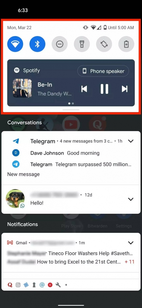 媒体播放器已略微移至“快速设置”窗格的底部。从屏幕顶部向下滑动即可看到迷你播放器;再次滑动即可查看全尺寸播放器。此外,如果有多个媒体应用程序在运行,则可以左右滑动以查看每个媒体应用程序的控件。