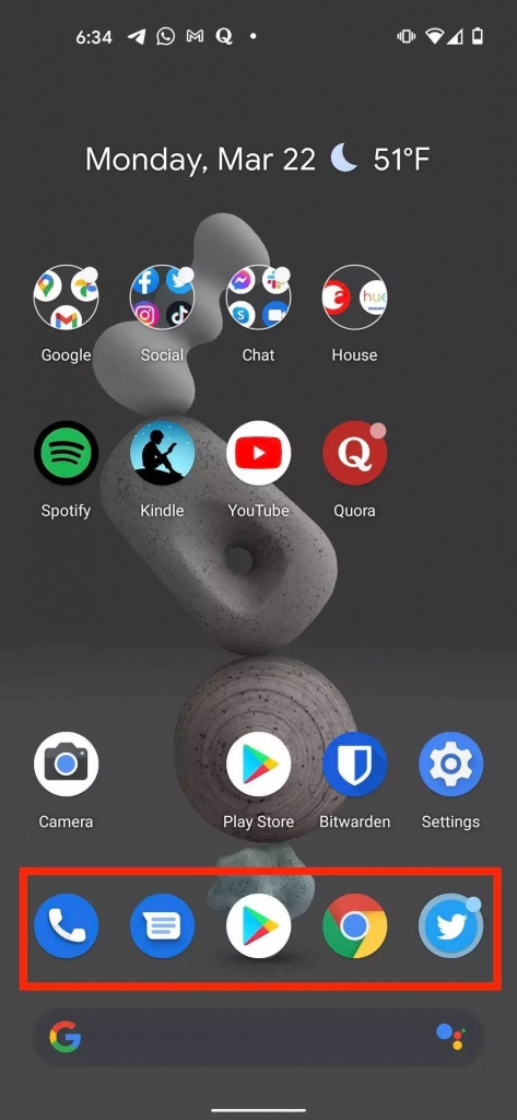 目前仅适用于Pixel手机的增强功能,Android 11会在主屏幕底部的未使用插槽中填充操作系统认为您可能要使用的建议应用程序。如果要关闭此功能,以便随机应用不会出现在主屏幕上,请在主屏幕上点住一个空白点,然后选择“主页设置”,然后点按“建议”并更改选项。