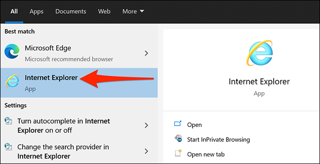 为此,请在Internet Explorer中打开“开始”菜单,搜索“ Internet Explorer”,然后在结果中单击浏览器。