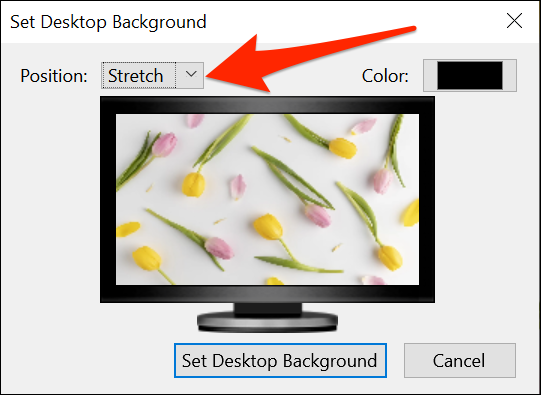 您会看到一个框,可让您定义墙纸在桌面上的显示方式。如果您在预览中看到墙纸没有覆盖整个屏幕,请单击“位置”下拉菜单,然后选择“拉伸”。
