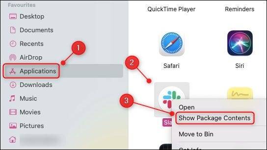 打开Finder窗口后,从边栏中选择“应用程序”,然后向下滚动到“松弛”。接下来,右键单击Slack图标,然后选择“显示软件包内容”。