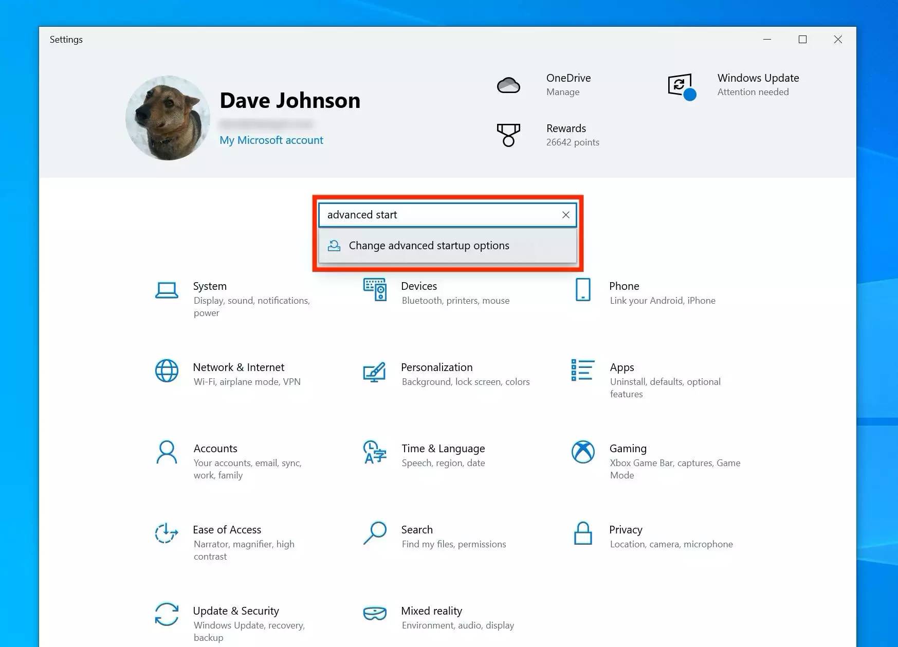 - 在“设置”搜索框中,键入“高级启动”,然后从下拉菜单中选择“更改高级启动选项”。
