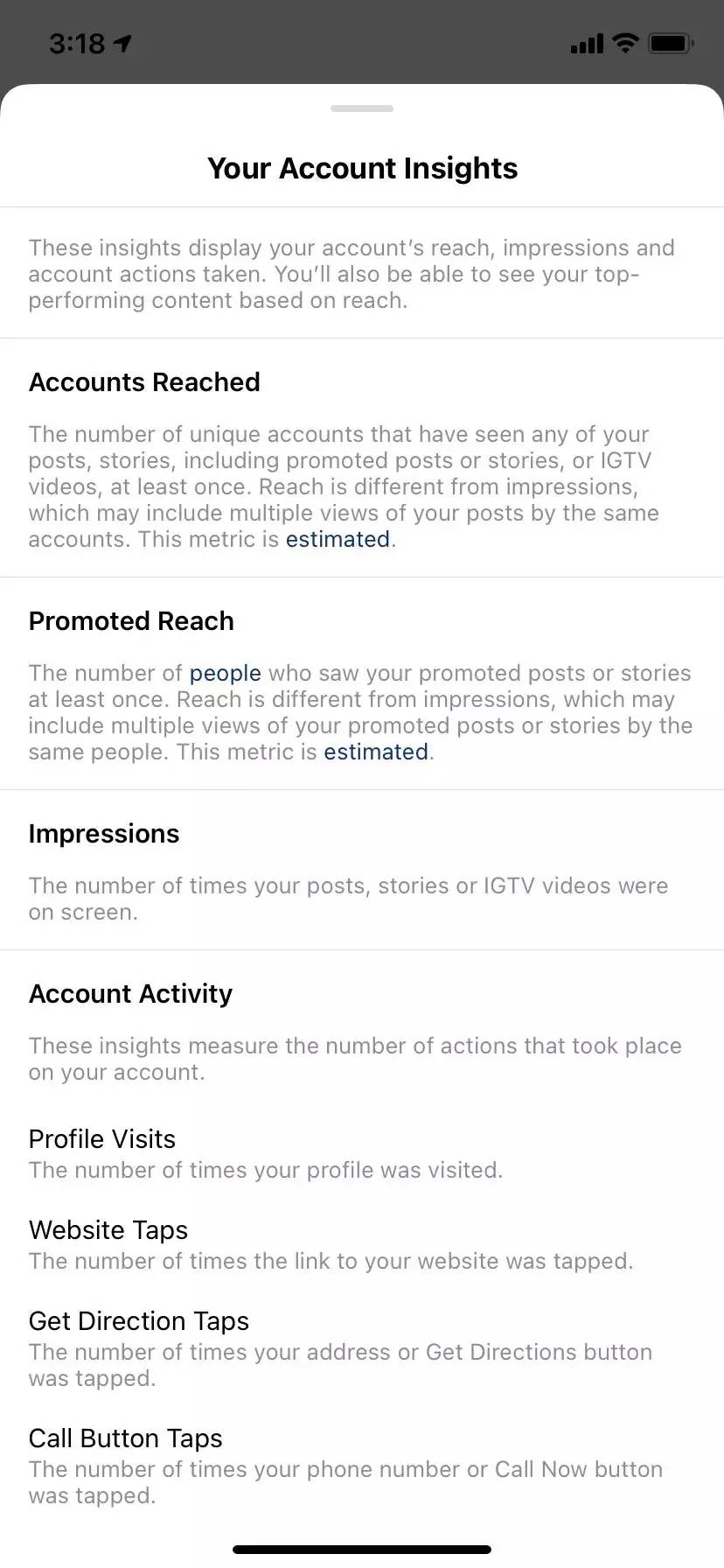 如果您拥有Instagram企业帐户,则可以访问您的帐户分析功能;如果您拥有Instagram企业帐户,也可以链接到您的Facebook企业页面。