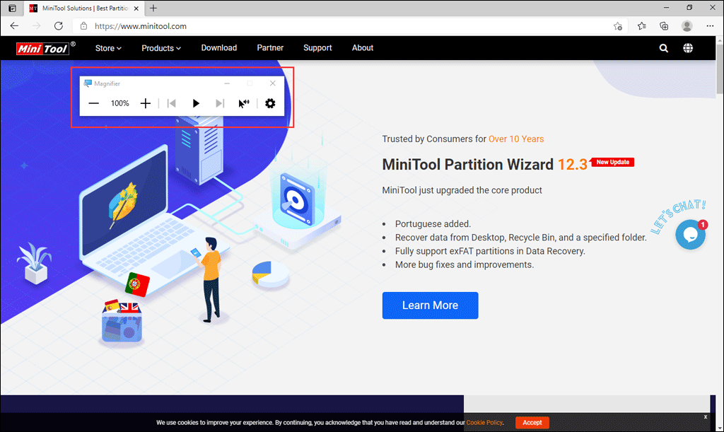 4. Windows 10放大镜将弹出。然后,您可以随时使用加号按钮放大应用程序,Web浏览器或其他一些应用程序。