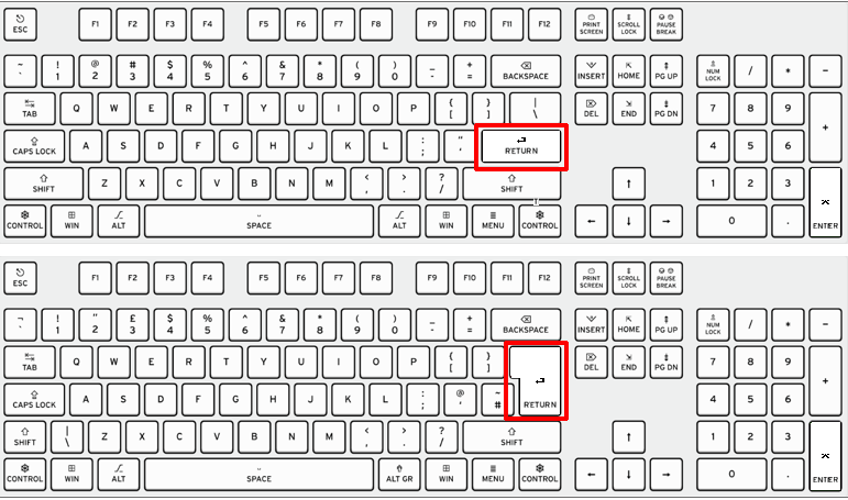 在ANSI键盘上时,您可以在第三行的右Shift键上方和反斜杠\键下方找到返回键。在ISO和JIS键盘上,返回键跨键盘的两行,跨越第二行和第三行,位于BACKSPACE键下方和右侧Shift键上方。您可以参考下图查找键盘上的返回键。
