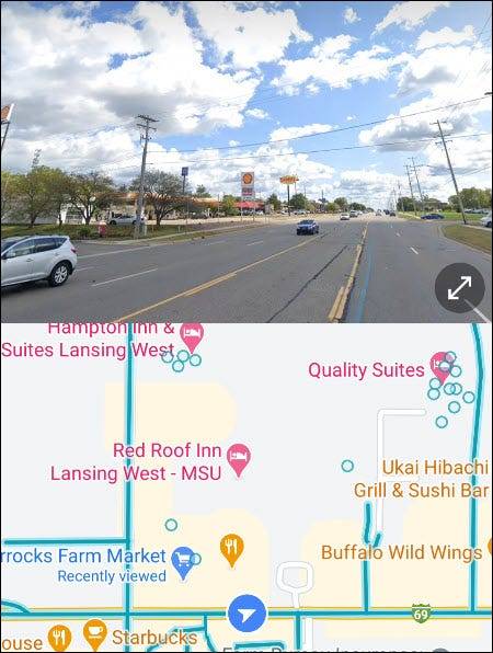 现在,“街景”将以全屏模式打开。为了查看街景视图和自上而下的地图,您要做的就是点击右下角的双箭头图标。