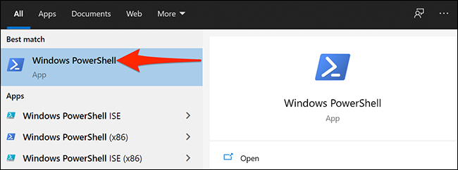 要获得针对您的网络的准确答案,请访问“开始”菜单,搜索“ Windows PowerShell”,然后在结果中单击PowerShell应用程序快捷方式。