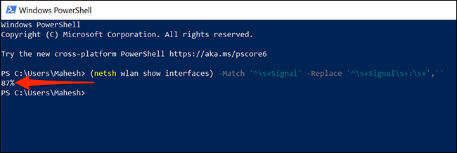PowerShell仅显示单行输出,以百分比形式显示当前的Wi-Fi信号强度。百分比越高,您的信号越好。