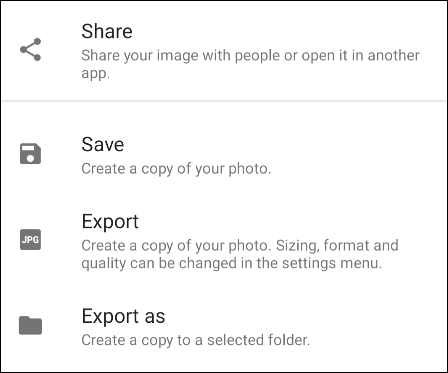 编辑完照片后,就可以“导出”照片了。Snapseed再次使这里的选项易于理解。如果您需要这样做,则可以直接共享照片,而无需使用其他应用程序。或者,您可以创建副本并选择要保存到的特定文件夹。
