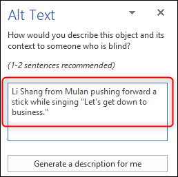 Alt Text窗格将出现在窗口的右侧。在文本框中键入所需的替代文本。