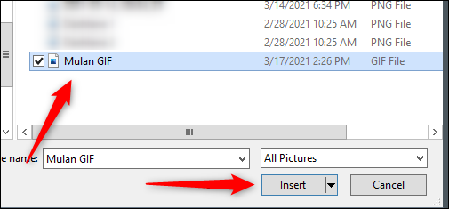 文件资源管理器将打开。找到并选择要插入的GIF。点击“插入”。