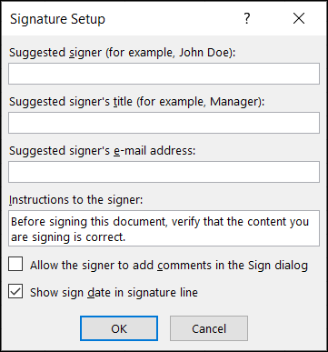 - 在签名行中显示签名日期:通常会包含签署文档的日期,因此,您绝对应该考虑选中包含此日期的复选框。